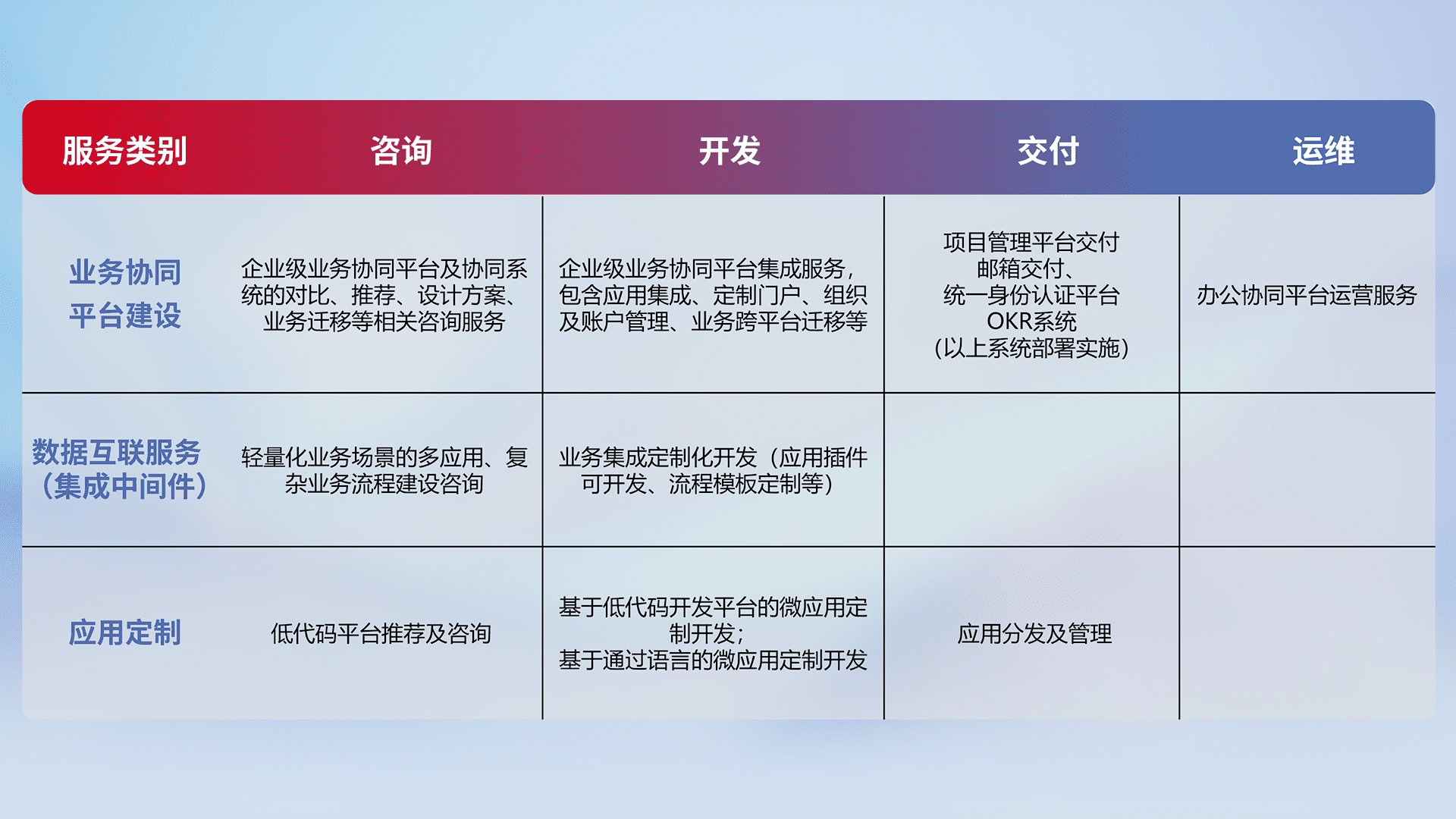 针对钉钉、、、企微、、IDaas等平台级产品提供产品的规划、、、方案、、、、交付、、定制化开发等服务,,实现如统一协同办公、、智能客户服务、、混合会议管理、、智能数据查询、、等业务场景,,实现数字化转型。。